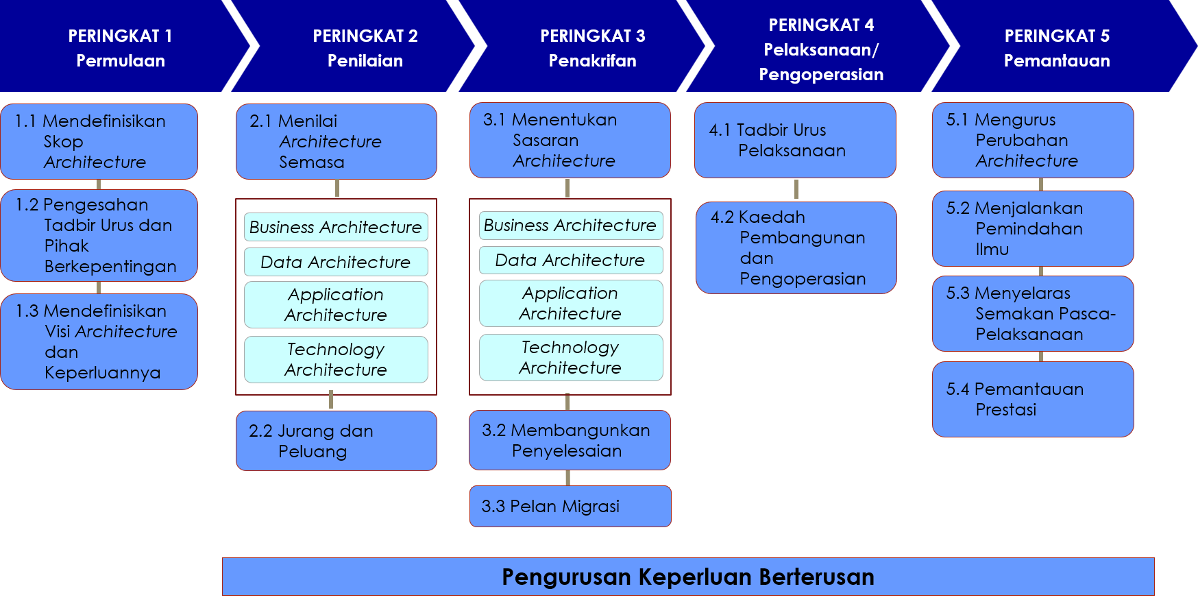 Metodologi MyGovEA menerangkan satu komponen penting dalam rangka kerja yang memberi tumpuan dalam menyediakan satu panduan menyeluruh yang perlu dijadikan rujukan oleh setiap agensi dalam memulakan pembinaan amalan EA. Metodologi ini terdiri daripada lima (5) peringkat pembangunan setiap peringkat terdiri daripada objektif dan hasil yang ditetapkan dan disokong oleh templat dan peralatan untuk membantu agensi tersebut mencapai sasaran di setiap peringkat.