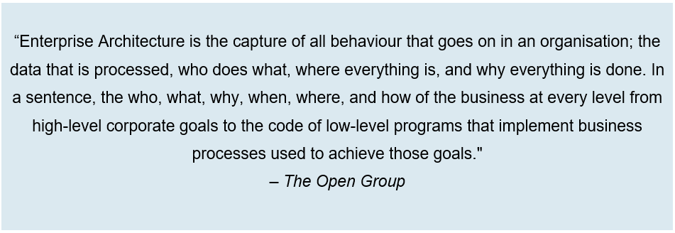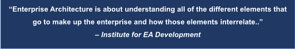 Enterprise Architecture (EA) pada dasarnya adalah suatu pendekatan untuk mendefinisikan sesebuah organisasi merangkumi pelbagai domain yang berbeza dengan menggunakan kaedah yang berstruktur. Kaedah berstruktur yang didefinisikan oleh EA ini membolehkan organisasi menerangkan aspek seperti berikut: